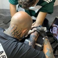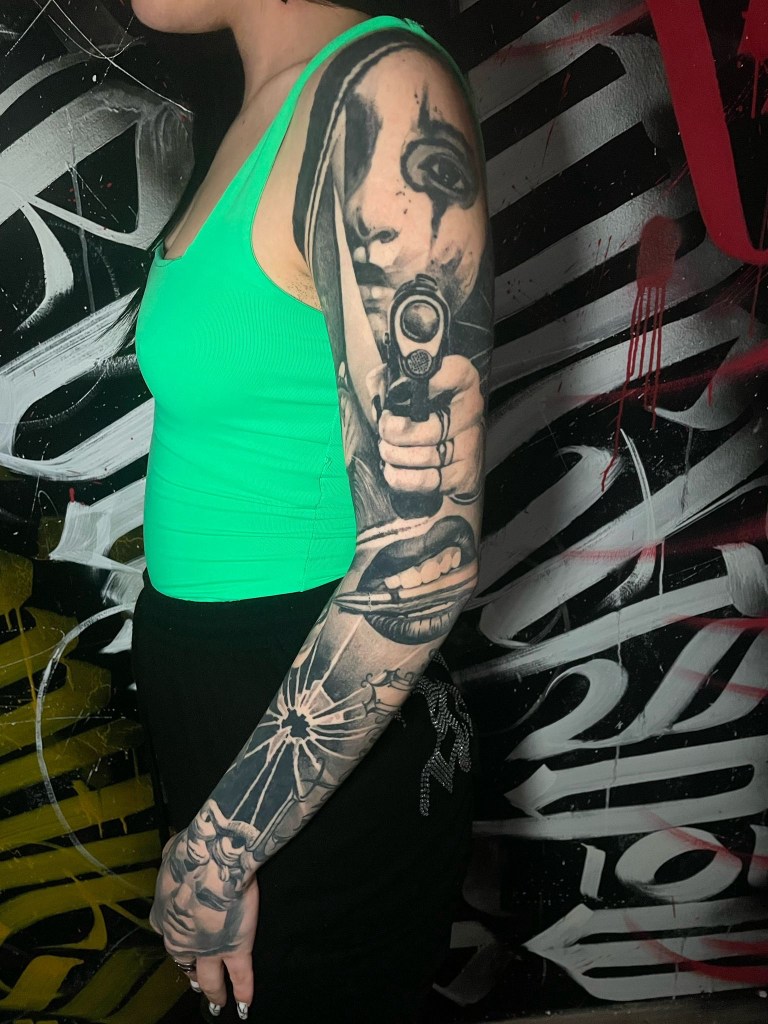 A close-up view of detailed tattoos on a person’s chest and arms, showcasing intricate designs and artistic elements.